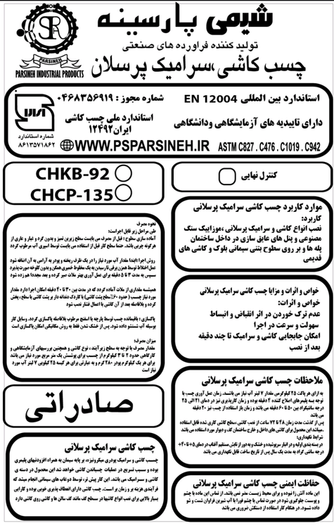 چسب کاشی پودری مخصوص سرامیک بزرگ و استخر پارسینه chcp135